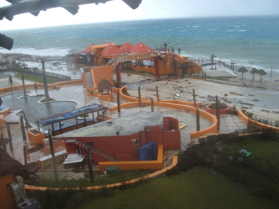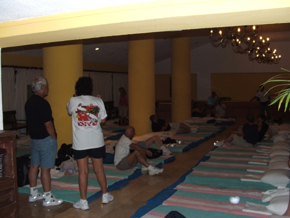 Our hotel, the Fiesta Americana Dive Resort, had a large restaurant on the third floor overlooking the lobby in the center of the hotel. The wall of windows on one wall were boarded up and some tall doors on the opposite side were nailed shut. And lounge chair mats were laid out for us in neat rows on the floor. This room was to be our refuge during the storm. We were asked to be in this room by 7pm Thursday night. There were just over 60 guests in this room with us. Two other smaller rooms also contained guests. We hunkered down on our little mats expecting to be there for the night. No one imagined we would be there for longer than 24 hours.