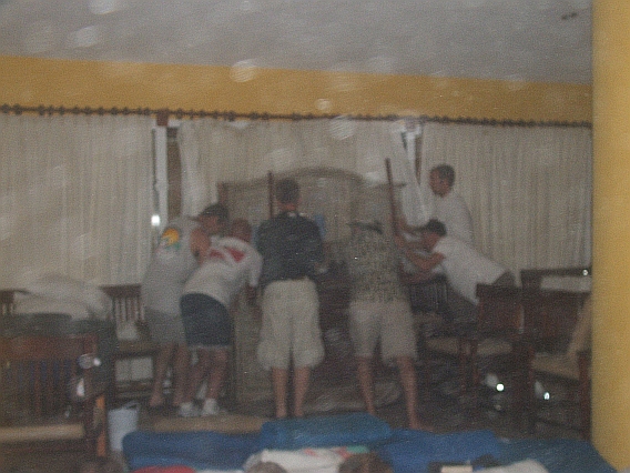 There was one tense moment on the second day when the winds got stronger as the eye approached. It was taking more than just a couple guys to hold the hutch against the doors and more plywood had blown away from another window. While the men tried to do what they could, the women and children were rushed to a lower level. As we descended the stairs, a stream of water was rushing down with us. None of us was too sure this was a good idea. We were taken to the laundry room of the hotel which to our relief was completely dry. The eye wall passed (we actually missed the eye by a few miles), and it was safer for us all to return to the restaurant. All night the wind howled as it had the past 24 hours. Most of us did not sleep even though we were thoroughly exhausted.