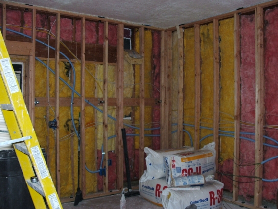 Once the electrician was done roughing everything in, a firebreak of packed fiberglass had to added. There is 16" all along the top, and a full bat all the way down the wall at no less than every 10'. This is code in the county we reside. Fiberglass was also packed in the gaps at the top and bottom of the walls.