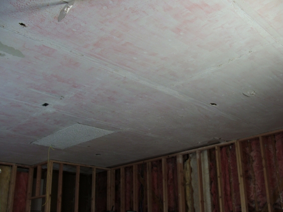 There were a few days between when the electrician started and he could clear his schedule to get back over to finish. We took advantage of that time to scrape the ugly popcorn texture off the ceiling in preparation for another layer of sheetrock and green glue later. It is a laborious process made easier with a spray bottle full of water. Spray an area, wait a second or two and start scraping. It helped to dry scrape the rough particles off first so the water can penetrate better.