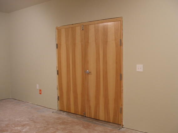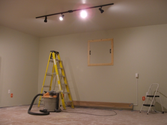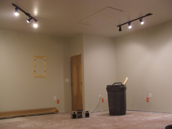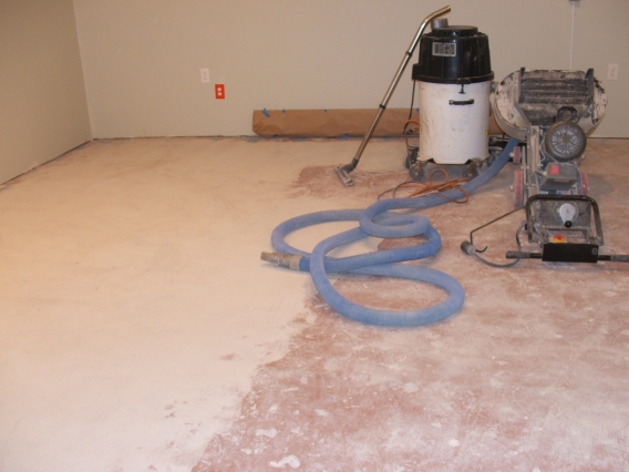 | | We brought someone in to grind the floor. This is to remove the existing paint and smooth out some roughness. The floor will have a stained and waxed finish when it is done in a couple weeks. We have trim to go in, acoustic treatments to go up then we can wire and move equipment in. The goal is to be tracking in this room by the end of June.